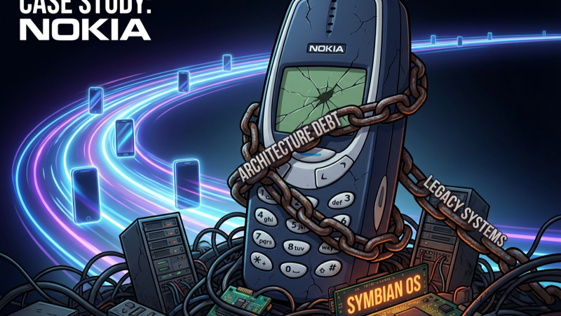 Wat er feitelijk gebeurde: In de jaren van hun dominantie bouwde Nokia een enorme technische en architecturale erfenis op. Toen de smartphone-revolutie (iPhone, Android) uitbrak, bleek hun fundament te rigide: