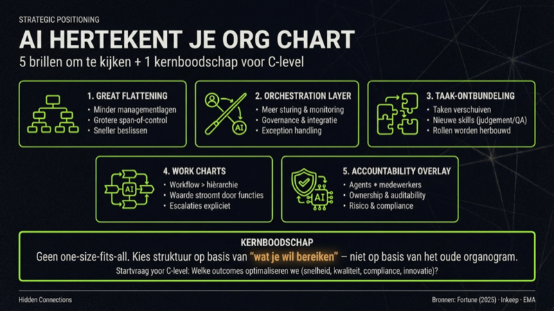 In dit frame verdwijnt middle management niet, maar verandert het: van “coördineren tussen mensen” naar “orkestreren van een socio-technisch systeem”. Ook dit wordt expliciet benoemd in analyses rond hoe org charts veranderen door AI. Bron: Fortune – AI reshaping corporate org charts